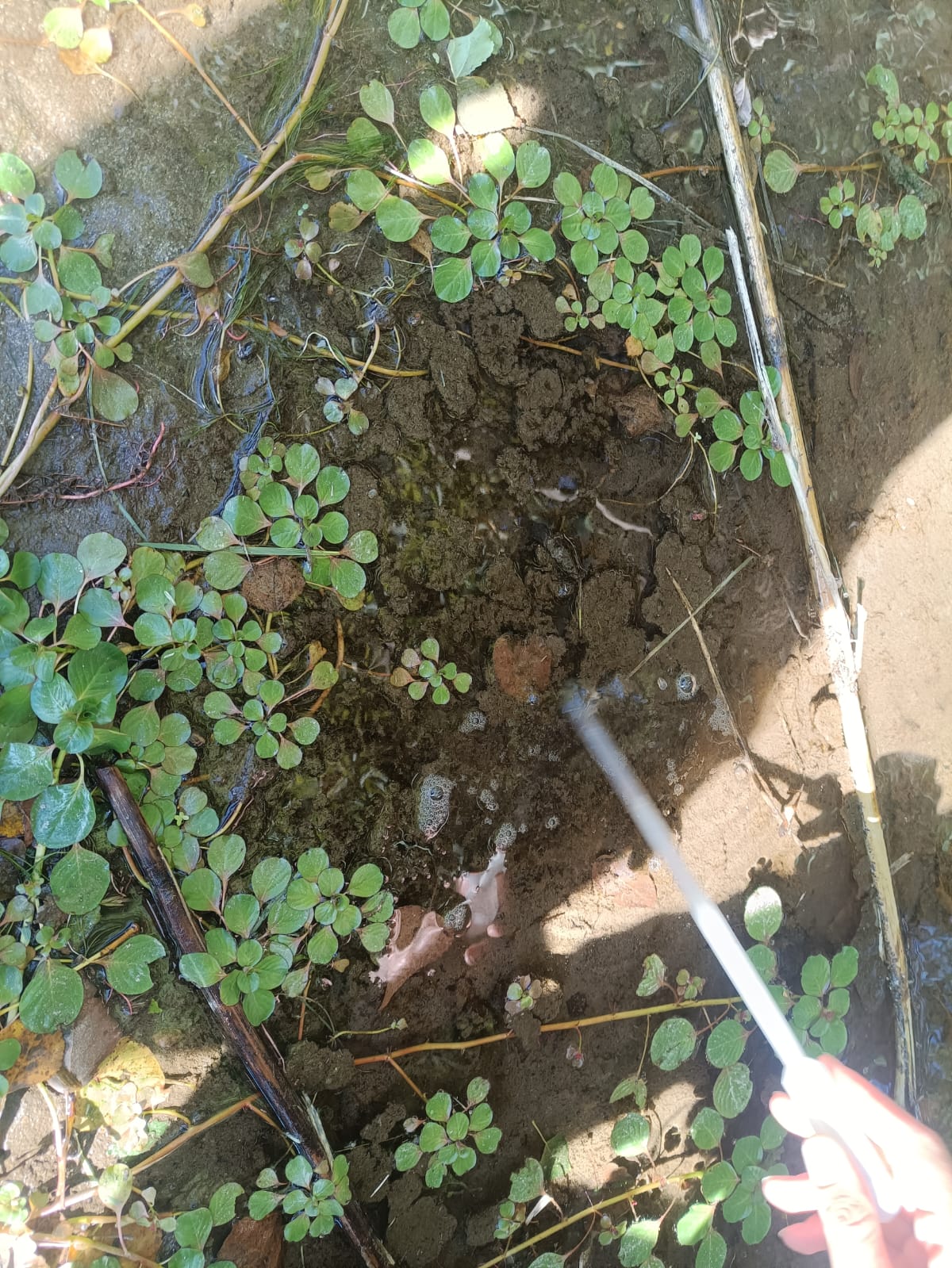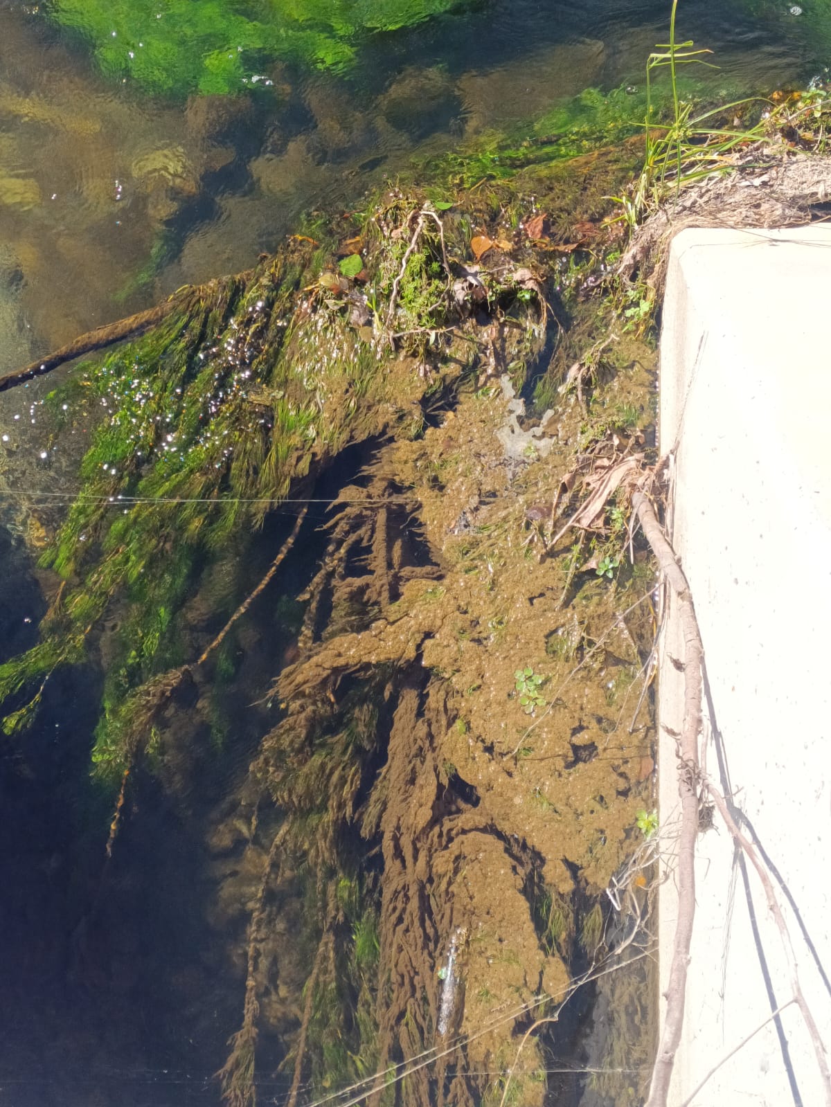 Ortaffa dans des conditions dégradées avec suspicion visuelle de prolifération de cyanobactéries : épais biofilm marron qui se développe sur le fond du lit, accumulation de flocs sur les berges. Aout 2024.
